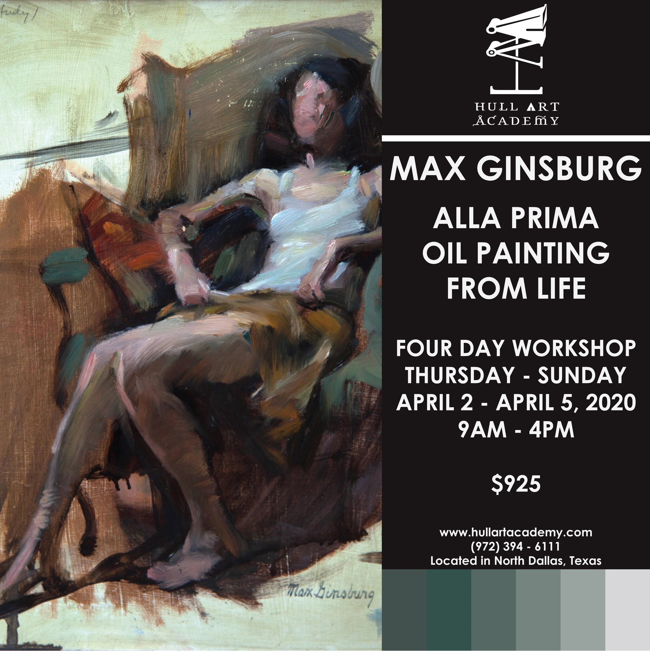 In this four day workshop, Max Ginsburg will paint for a half-hour each day to demo and explain procedure, approach, materials, color, etc. Most of each day, 9:30 AM - 4:00PM, the students will paint the assignments from life, and Max will critique each student’s work. Below is a general outline of the workshop.